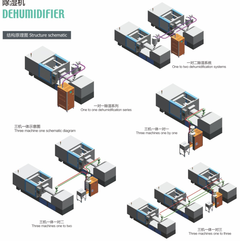 ◆ One dehumidifier can be used with several independent drying hoppers.