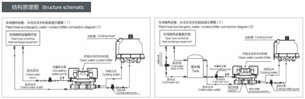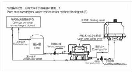 ◆ This model must be installed with a cooling water tower or other cold water sourceand a cooling circulating water pump before it can be used. If this condition is notavailable, please choose another chiller from our company: box-type air-cooledchiller.